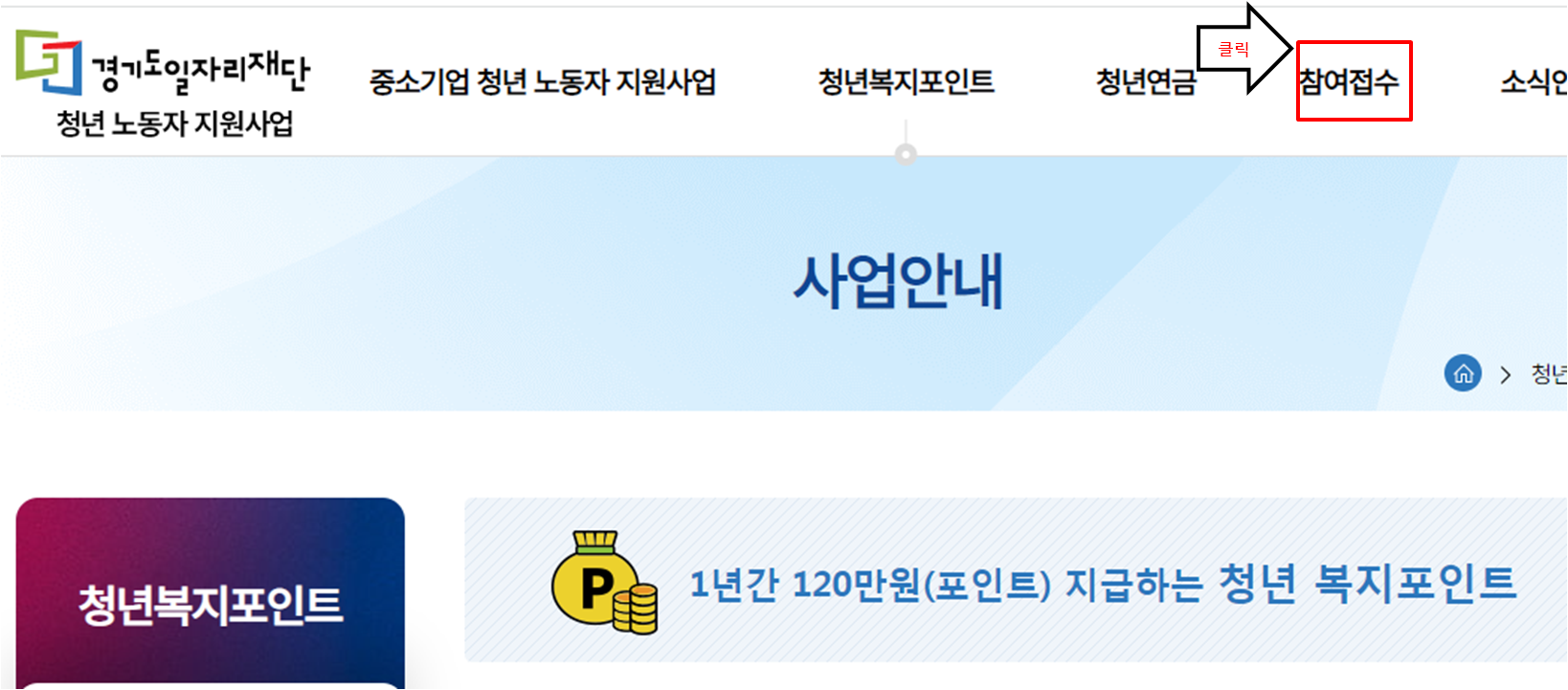 ② '상단메뉴 중 - 참여접수 클릭 - 청년복지포인트' 에서 참여자격 확인 후 접수 가능합니다
